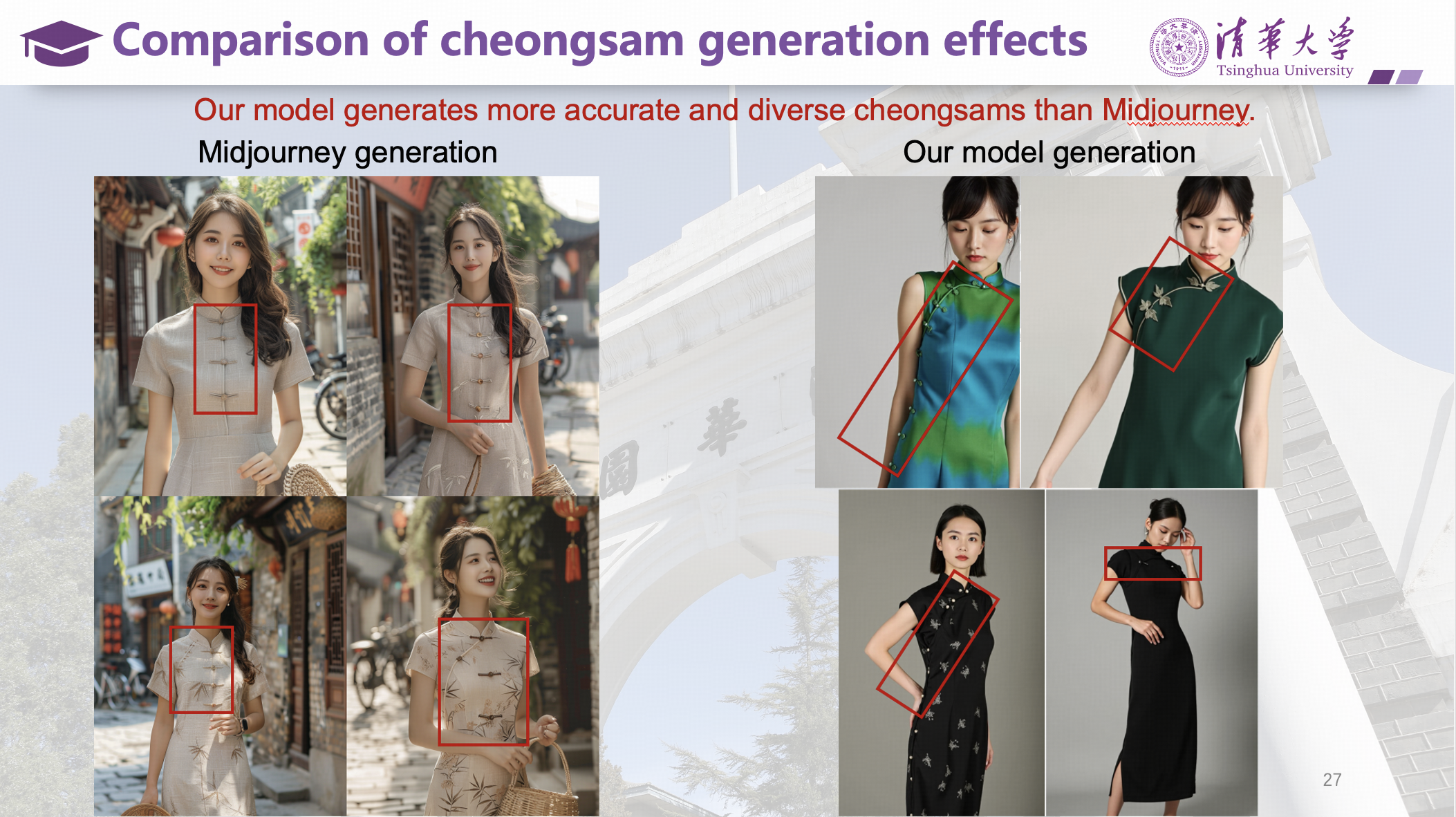 (1) AIGC-assisted cheongsam design platform, which has surpassed the state-of-the-art text-to-image foundational model, Midjourney, in cheongsam design generation. The comparative experimental results are shown in the figure below:
